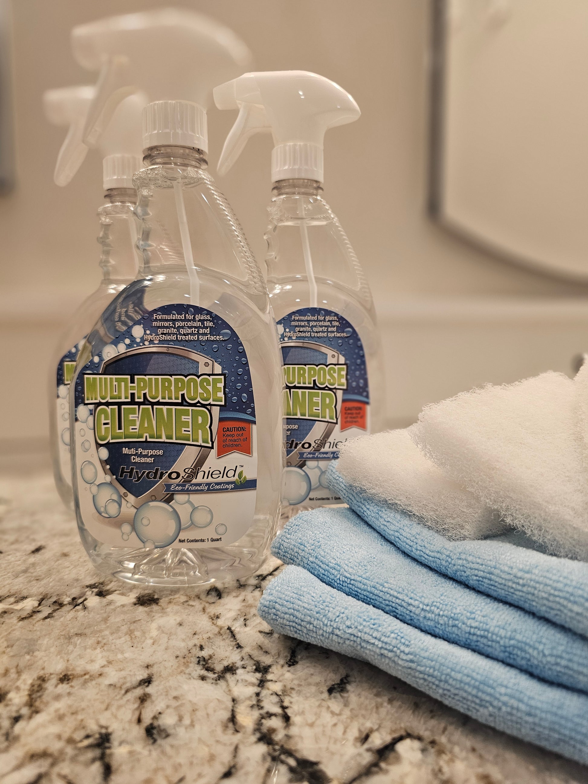 6 each of HydroShield Multi-Purpose/ Glass Cleaner, Microfiber towels, and non abrasive scrubby pads.
